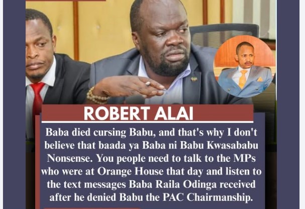 Kilemba cha siasa kimewaka moto tena baada ya kauli kali kutoka kwa Kileleshwa MCA, Robert Alai, kumhusu mbunge wa Embakasi Mashariki, Babu Owino, na kiongozi wa ODM, Raila Odinga.