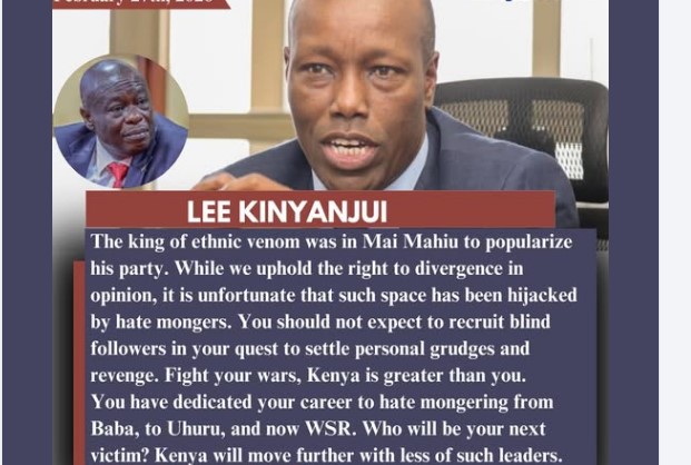 Former Nakuru Governor Lee Kinyanjui has strongly criticised Deputy President Rigathi Gachagua, accusing him of using political platforms to spread hate.